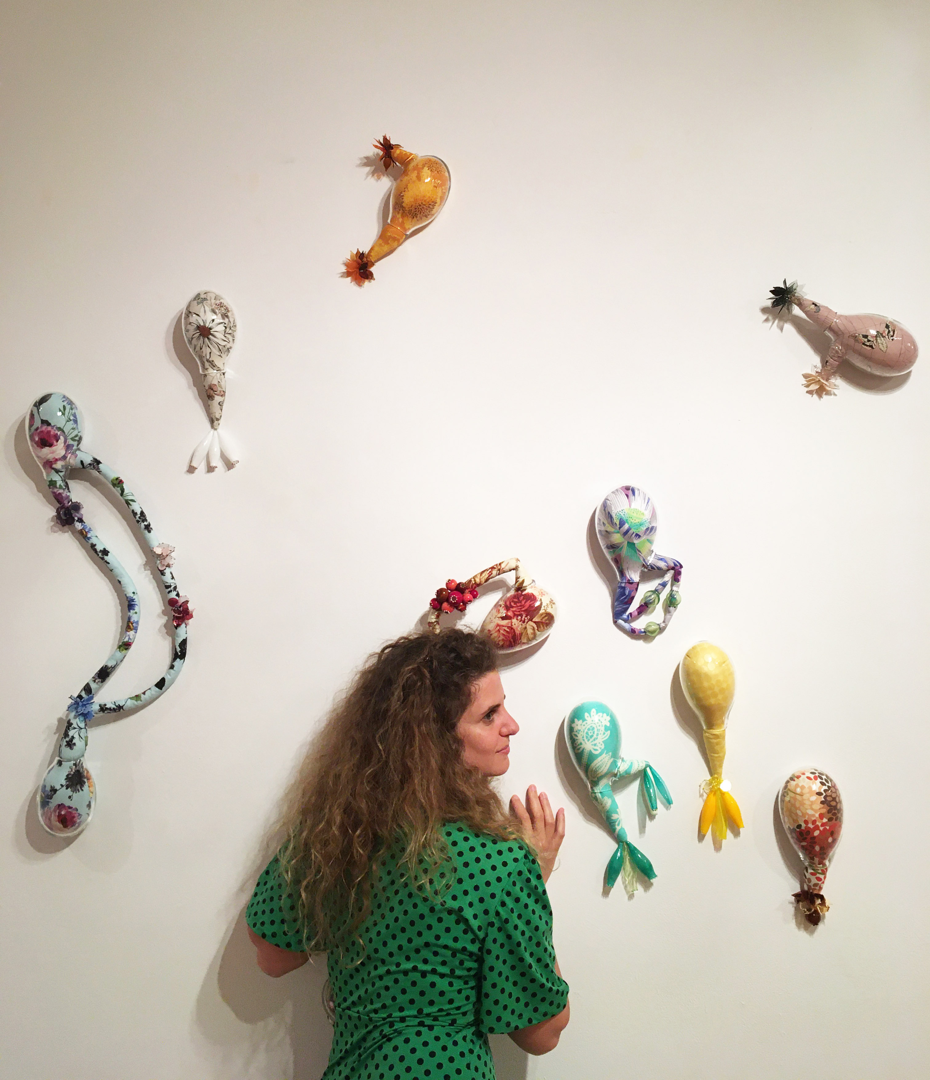 Unlike her condition’s startling nature, the deformities added onto the smooth surface of her blown glass structures are deliberate. On one hand, Muntadas’ use of organic curves reminds us of the uterus and ovaries. These have been ornamented with an array of textiles and decorated with smaller flame-worked pieces.