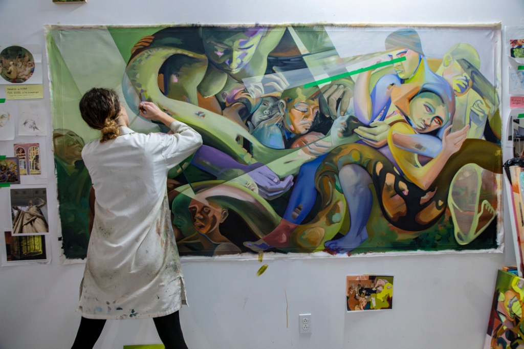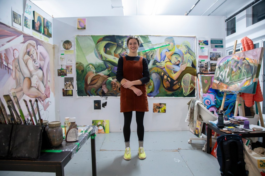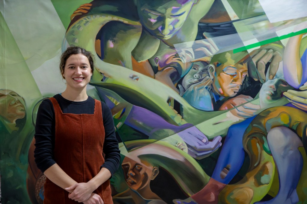 Sarah Cloutier est une artiste peintre figurative basée à Montréal. Elle complète présentement une maîtrise en arts visuels et médiatiques à l’UQAM (Montréal) et elle est diplômée de l’Université Concordia (Montréal) avec une majeure en Studio Art et une mineure en Sociologie. Ses recherches artistiques explorent le rôle de la matérialité de la peinture à l’ère du numérique et de l’économie de l’attention. À travers la peinture, elle questionne le regard et fait entrer le présent, vécu et senti, en dialogue avec l’histoire de l’art. Sa peinture interroge l’aliénation du corps et de la pensée en contexte d’hyperproductivité, ainsi que le mythe de l’immatériel qui façonne l’ère du numérique. Son travail a fait l’objet de deux expositions solos, Comprendre qu’on ne comprend rien (2022) et Vanités de confinement (2022). Il a également fait partie de plusieurs expositions collectives, dont Peinture fraîche et nouvelle construction à Art Mûr (2024), Aperception à l’UQAM (2023), Ouverture(s), L’art qui redonne dans le Village, le projet d’art public du REM – Programme UniR, et le Symposium de la Peinture de la Petite-Rivière-St- François.